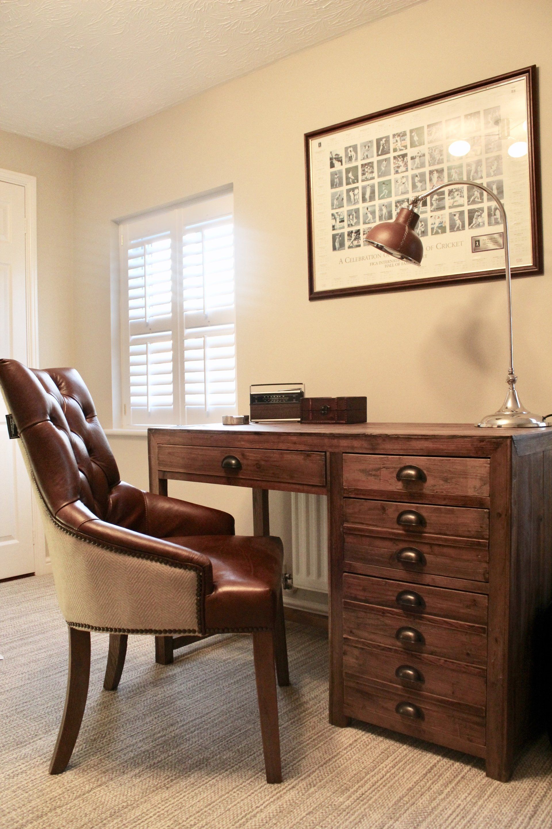 The brief entailed creating a multifunctional room from a small space. The client wanted a masculine softly themed study, in which guests could stay should they require. Using the clients supplied cricket artwork, we used key features with gentle undertones of shapes and textures that revive a sense of nostalgic cricket memorabilia. With rustic wood finishes, tan tones and stitched leather, this room came together as the perfect study space. The bespoke made sofa bed offers comfort, sophistication and functionality.